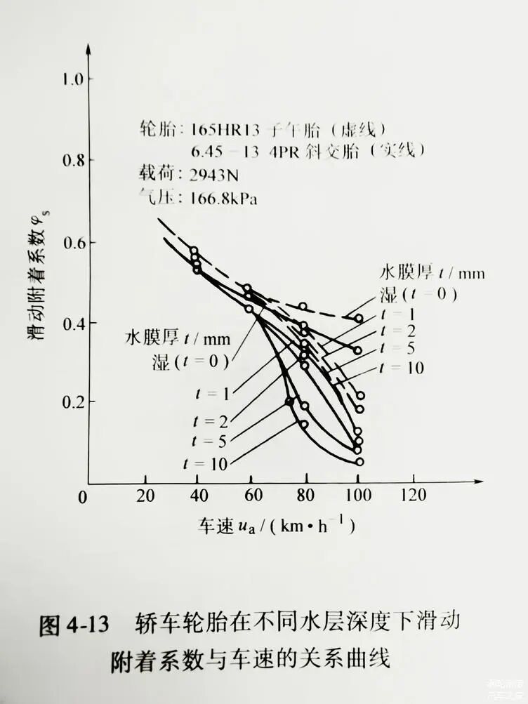 在理论条件下,是可以大概估算发生水滑现象时的车速的,但是它的计算非常复杂,它跟路面结构、水层厚度、水液粘度和密度、轮胎充气压力、垂直载荷、花纹形式以及轮胎的磨损程度都有关。