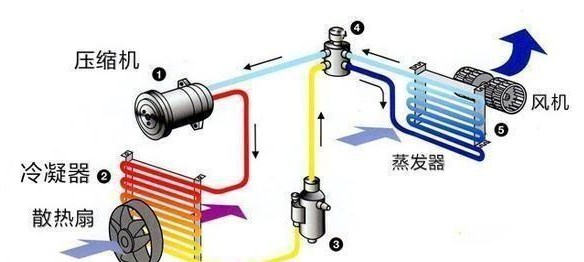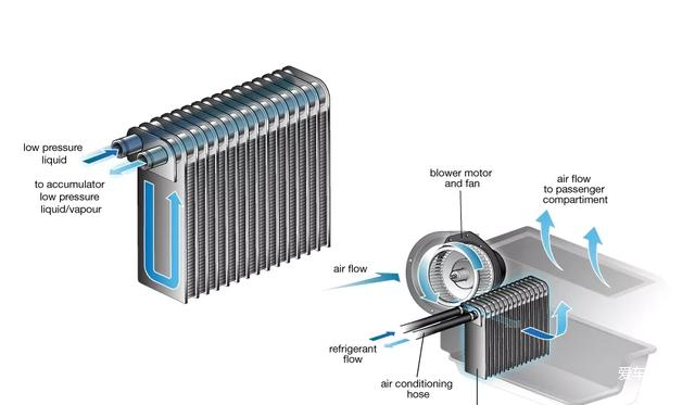 上图是汽车空调系统原理图,我们只需要了解个大概就行。压缩机将气态冷媒压缩成高温高压的气态,然后来到冷凝器,在这里散热风扇给冷媒降温,冷媒变成液态。液态冷媒经过干燥后来到位于驾驶舱内的蒸发器,在这里液态冷媒汽化,吸收大量热量,在蒸发箱产生低温。然后风机带动气流经过蒸发箱,气流被降温后送入驾驶舱。