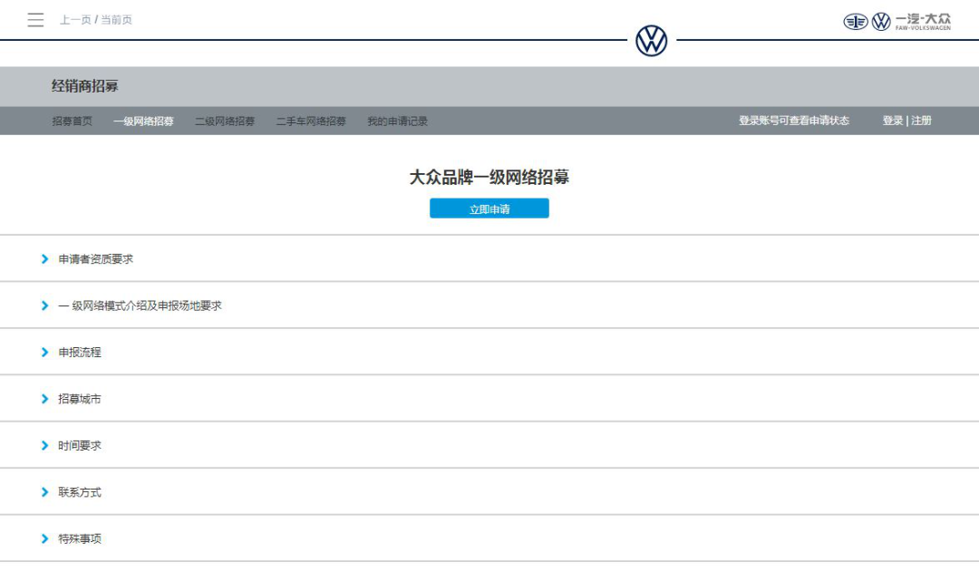 经销商在线招募系统是大众品牌发布招募信息的官方渠道,同时也是经销商提交建店申请的唯一渠道。系统以月度为周期发布招募信息,具体包括:申请单位资质要求、网络模式介绍及场地要求、申报流程、招募城市、时间要求、联系方式、特殊事项等。