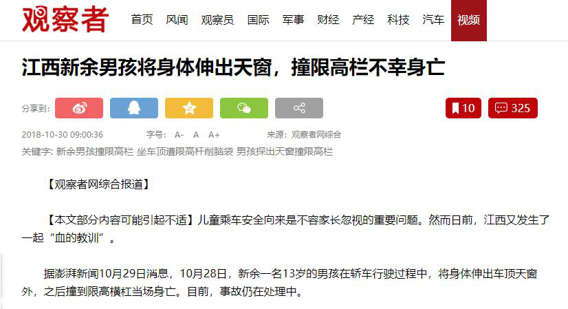 当前许多车型也已经具备天窗功能,甚至是全景天窗也正在普及,就算是天窗都具备“防夹”功能,也不能允许孩子把身体部位伸出车窗或者天窗外“兜风”,以免意外的发生。
