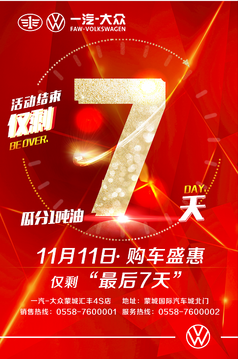 双十一抢购会报名现已火热开启,您只需要一个电话,就能参与本次一汽-大众蒙城汇丰抢购会活动。