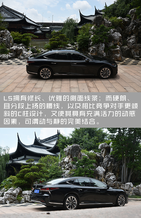 来到车身侧面,得益于低重心的设计思路,LS拥有修长、优雅的侧面线条;而硬朗、且分段上扬的腰线,以及相比竞争对手更倾斜的C柱设计,又使其具有充满活力的动感因素,可谓是动与静的全面结合。