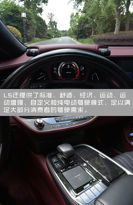 此外,LS还提供了7种驾驶模式选择,除了标准、舒适、经济、运动、运动增强和自定义模式,LS 500h还可切换至纯电动模式。行驶中,切换至运动模式时,车辆的油门响应速度、发动机转速都会得到明显提高,驾驶的激情也得以释放;而切换至舒适模式,静谧、平稳的路感,无疑又将为后排乘客带来最舒适的旅程享受。其可动可静的驾驶、乘坐感受,足以满足大部分消费者的需求。