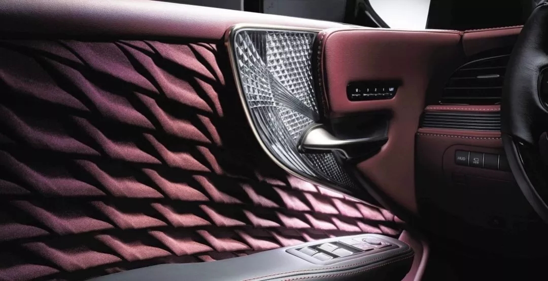 与大胆前卫的外观相比,LS的内饰更像是东方传统工艺的“炫技”。车门饰板灵感源自传统折纸工艺的鹤羽折布,每一块饰板都经过匠人手工折制而成,通过精准的折叠呈现出具有独特光影效果的立体纹理,折布可以随光的角度改变而呈现不同视觉效果。与之搭配的是凌光切子玻璃内饰,传承于江户时代Kiriko切子玻璃器皿,在透明的玻璃上切入各式各样的图纹,可随光线的强弱,呈现出不同的光泽效果和颜色变化。