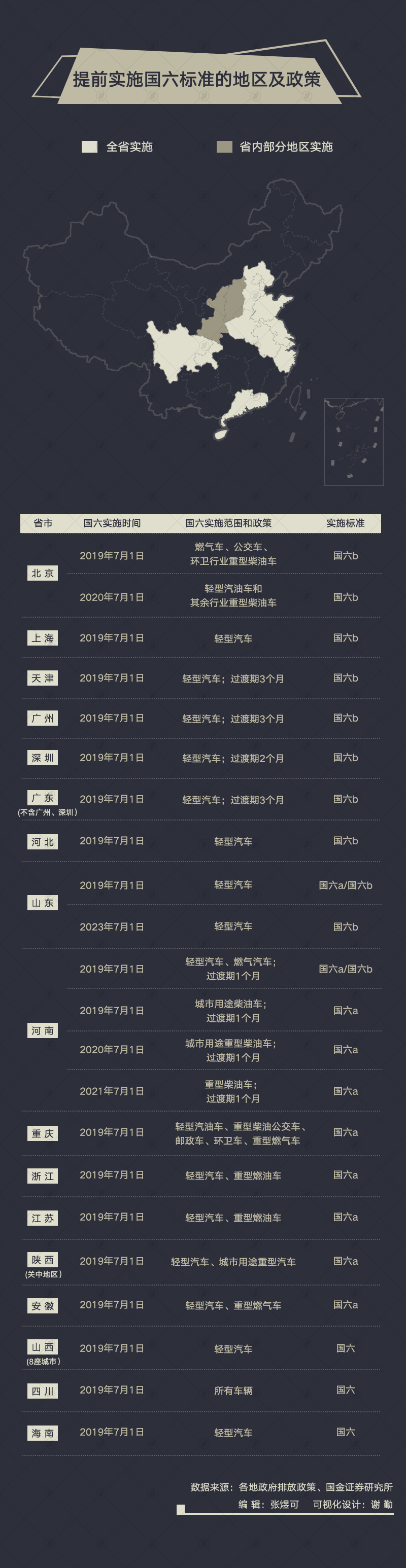 在目前决定提前实施国六标准的15 个省市中,除北京于2020年1月1日起对轻型汽车实施国六标准外,其余于 2019 年7月1 日起实施。