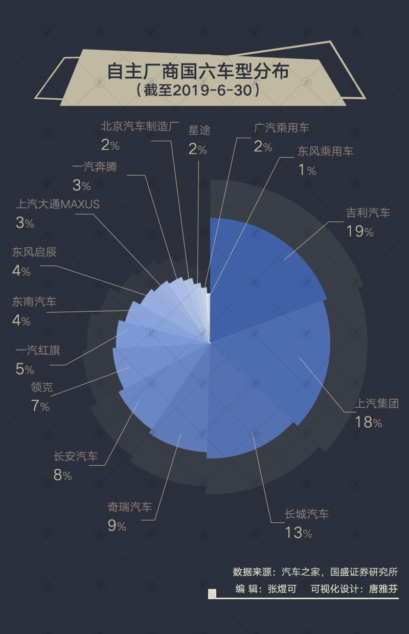 前五龙头厂商推出的国六车型数量约占全行业的67%(吉利、上汽、长城、奇瑞、长安)。