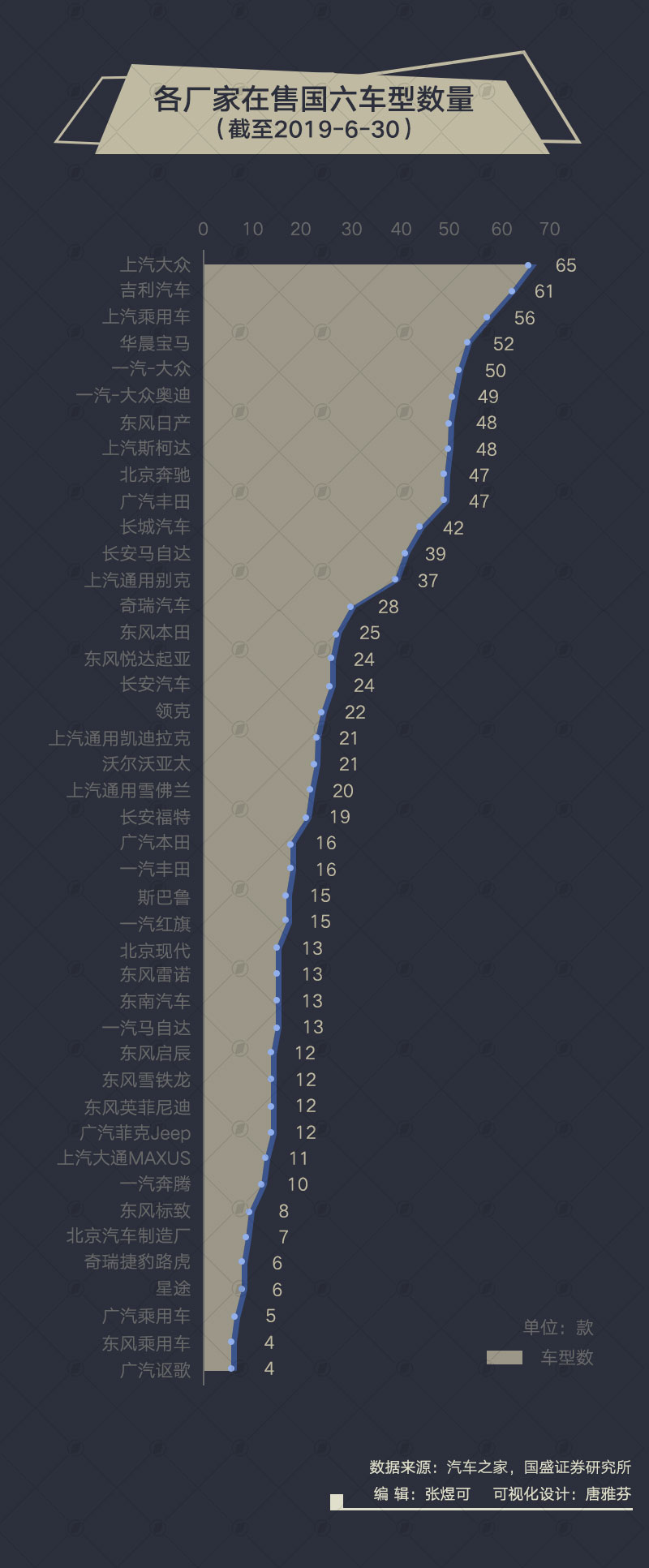 细分到国内自主品牌,排名前五的厂家为吉利、上汽、长城、奇瑞、长安,分布推出了61、56、42、28、24款产品。