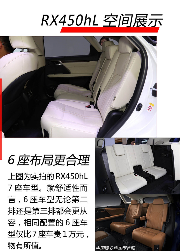 加长车型RX450hL的变化是增加了第三排座椅,可以容纳6座或7座两种布局,7座车型在今年6月的深港澳车展已经亮相过,6座车型是在国内首次亮相。预售价格中,相同配置的7座车型较5座车贵2.2万元,6座车型比7座车贵1万元。