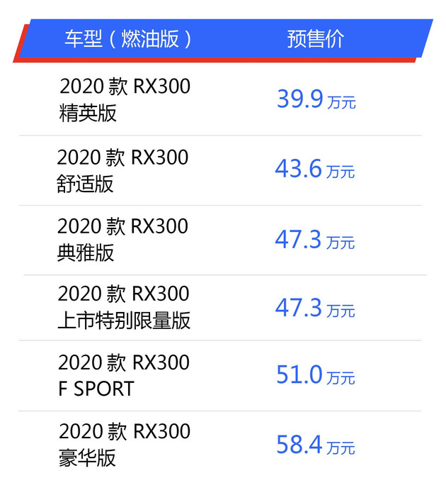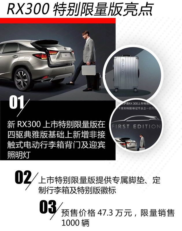 新款RX上市之际还推出RX300上市特别限量版,该车型在RX300典雅版基础上,新增非接触式电动行李箱背门及迎宾照明灯,并特别提供专属脚垫、定制行李箱及特别版徽标,全国限量销售1000辆,预售价格与RX300四驱典雅版同为47.3万元,性比价更高。
