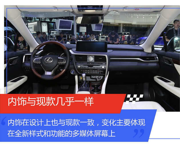 新款雷克萨斯RX属于中期改款车型,外观内饰的变化并不大。外观上仅前格栅内部形状、前后大灯组及前雾灯有明显改动。内饰方面整体设计没有变化,配置上增加了可触控的12英寸中控液晶屏,以及CarLife智能互联系统,车机功能得到了大幅提升。