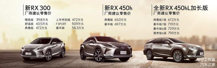2019年6月5日,雷克萨斯在成都车展期间推出中大型豪华SUV新RX及全新RX 450hL加长版。新RX家族旗下12款车型,包括2款动力总成、2种车身尺寸和3种座舱布局,售价区隔分别为39.8万元~79.9万元。