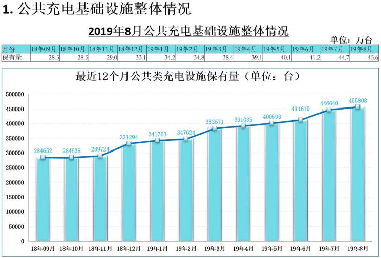 近日,中国电动汽车充电基础设施促进联盟公布了最新国内充电桩情况,截至2019年8月,联盟内成员单位总计上报公共类充电桩45.6万台,同比增长63.5%。其中交流充电桩26.5万台、直流充电桩19万台、交直流一体充电桩549台。