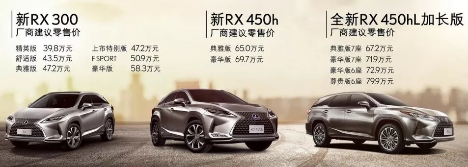 新一代的RX于2016年推出,有新的动力总成,开始采用8挡自动变速器。混合动力车型也使用新的动力总成,同时,车辆的安全装备达到了行业顶级。现在面对我们的,是一个新的系列,经过重要升级后,车系共有12款车型,包括2款动力总成、2种车身尺寸和3种座舱布局,厂商建议零售价为39.8万元—79.9万元。其中,RX 300上市特别版是在典雅版基础上新增非接触式电动行李箱背门,并提供特别版徽标、定制行李箱及专属脚垫,限量销售1,000台
