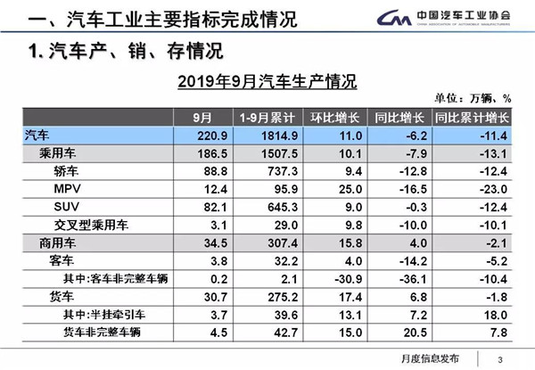 中汽协公布的数据显示,9月,汽车产销量分别为220.9万辆和227.1万辆,比上月分别增长11%和16%,比上年同期分别下降6.2%和5.2%,产量降幅比上月扩大5.7个百分点,销量降幅比上月缩小1.7个百分点。9月汽车销量同比降幅收窄,1-9月的降幅也比1-8月收窄0.7个百分点。1-9月,汽车产销分别完成1814.9万辆和1837.1万辆,产销量比上年同期分别下降11.4%和10.3%。