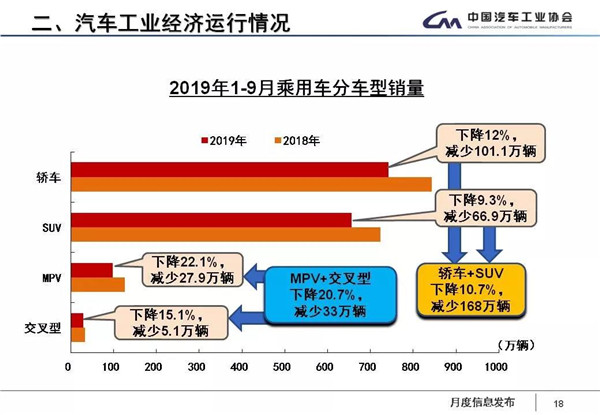 尽管降幅收窄,但这一降幅仍没达到中汽协的预期,中汽协秘书长助理陈士华表示,从今年9月产销数据完成情况看,与上月相比,呈现了明显回升,行业销量同比降幅也比上月有所收窄,但降幅依然较大,延续了去年7月份以来的下降态势,我国汽车产销量已连续15个月同比下降,其中新能源汽车也连续3个月下降,消费动能仍处于不足状态。从乘用车车型看,本月所有车型同比均呈现下降,企业面临的压力没有有效改善;商用车相对较好,本月产销均呈现正增长。三季度,在一系列稳就业、稳金融、稳外贸、稳外资、稳投资、稳预期的政策作用下,汽车产销降幅出现了收窄。