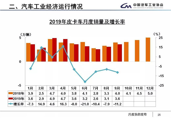 值得关注的是,1-9月,皮卡车产销分别完成32万辆和32.1万辆,产销量比上年同期分别下降6.4%和4.9%,降幅大于货车整体。
