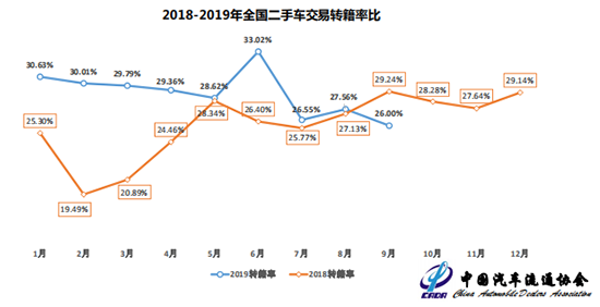 近年来,伴随全国解除二手车限迁政策的逐步推进,极大促进了二手车的流通,有效盘活市场资产。从月度转籍比例的走势来看,2019年的转籍比例明显高于历史同期,跨区域流通出现了非常明显的增长。