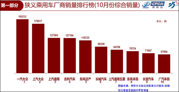 车企方面,2019年10月,狭义乘用车零售销量排名前三的企业是一汽-大众、上汽大众、上汽通用;中国品牌方面,吉利、长城、长安再次一起进入前十强榜单,其中吉利汽车(5万大奖)以10月份零售12.7万辆排名第四,相比9月排名上升1位。长城汽车以9.6万辆排名第六,长安汽车则以7.2万辆排名第九。