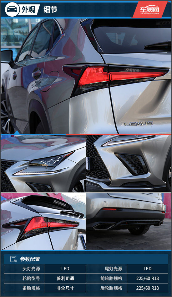当时颇受争议的分体式LED日间行车灯在此后雷克萨斯全新车型上归于常规,集成在大灯组内。但也正因如此,恰巧赋予了NX截然不同的个性因子。此次的试驾车为F SPORT版本,前进气坝尺寸更大,并增加了镀铬装饰的前唇以及双边共两出外露式排气,有效提升了运动感。
