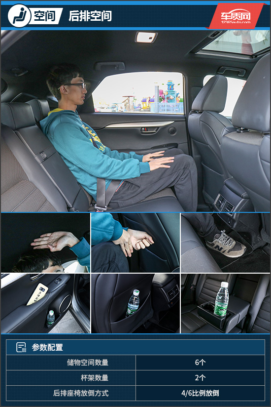 保持前排座椅位置不变,体验者来到第二排,坐好后头部空间四指,腿部空间一拳三指,较为宽裕。同时后排地台的凸起并不高,能够保证后排中间乘客的乘坐舒适度。储物方面,后排门板与前排一样也采用了封底式拉手设计以及底部储物槽,可以放置多种随身物品。前排座椅后方配备了背袋,进一步扩展了后排的储物能力;后排中央扶手前端的杯架与前排一样配备了限位器,人性化满分。