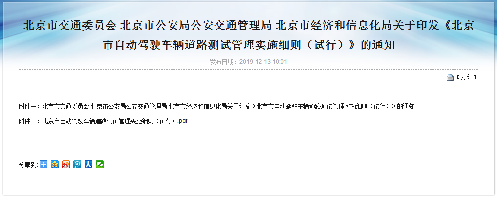 12月15日,北京市交通委员会、公安局公安交通管理局、经济和信息化局三部门联合印发了《北京市自动驾驶车辆道路测试管理实施细则(试行)》(京交科发[2019]19号)(以下简称《细则》),对此前发布的实施细则进行了修订,首次允许自动驾驶测试主体进行载人载物和编队行驶测试。