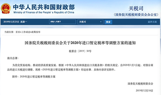 经济日报-中国经济网12月24日讯经国务院批准,国务院关税税则委员会昨日印发通知,自2020年1月1日起,调整部分商品进口关税。