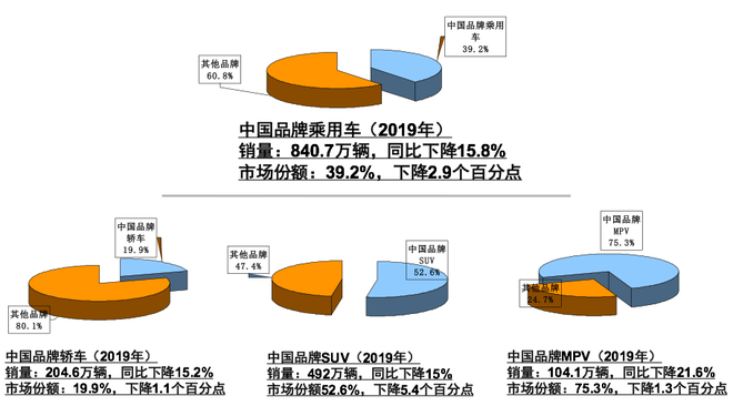根据中汽协公布的数据显示,2019年自主品牌乘用车累计销量840.7万辆,同比下降15.8%,市场份额39.2%,下降2.9个百分点。自主品牌乘用车销量降幅远超乘用车市场整体降幅,可见2019年自主品牌车企是有多艰难。