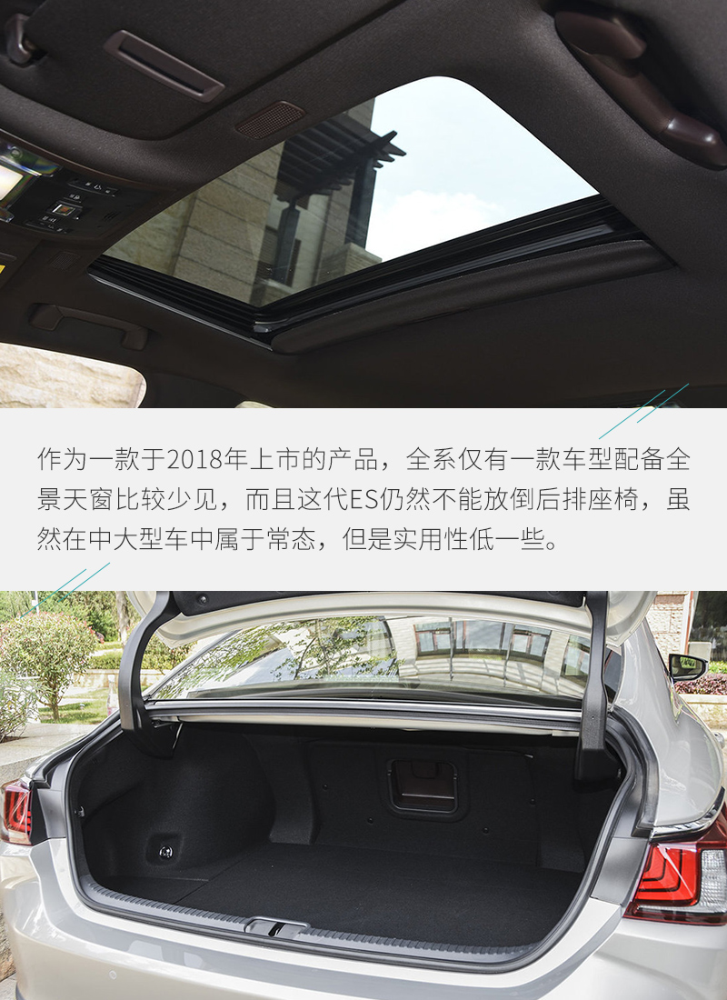 好的方面介绍完,我们说点美中不足的问题,主要集中在两个方面,首先是天窗,除了ES 260尊享版采用可开启全景天窗外,其它车型只配备常规天窗。第二点小小的遗憾是这代ES仍然不能放倒后排座椅。