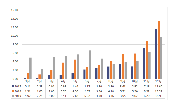 尽管动力电池的产销量差距并不大,但装车量却有一定差距,这在一定程度上跟动力电池生产销售早于车企新能源汽车的生产周期有关。2019年,动力电池装车量达到62.2GWh,同比累计增长9.2%。尽管全年维持了正增长,但从月度数据看,动力电池下半年感受到了明显的压力。从8月开始,动力电池的月度装机量都较去年有了不同程度的降低,12月降幅高达27.4%。