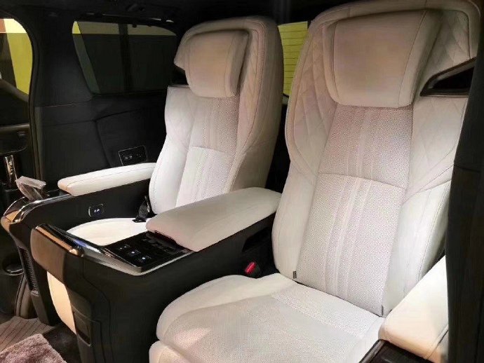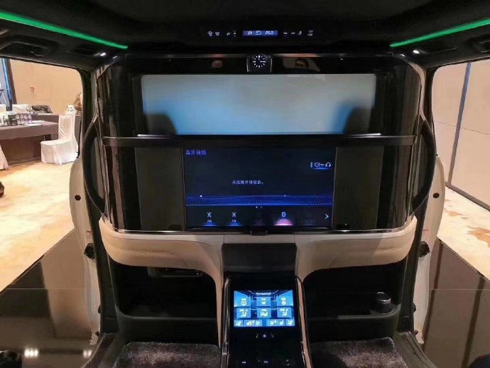 车厢内部方面,后排配备了一个26英寸的大电视,并且配备有19扬声器的马克莱文森音响,也有车载冰箱、氛围灯、座椅按摩等功能。第二排的两个独立座椅非常上档次,整体包裹性非常强,配备了电动的腿托,支持座椅大幅度后仰。车的中间有独立的多媒体控制区域,整体的奢华氛围非常强。