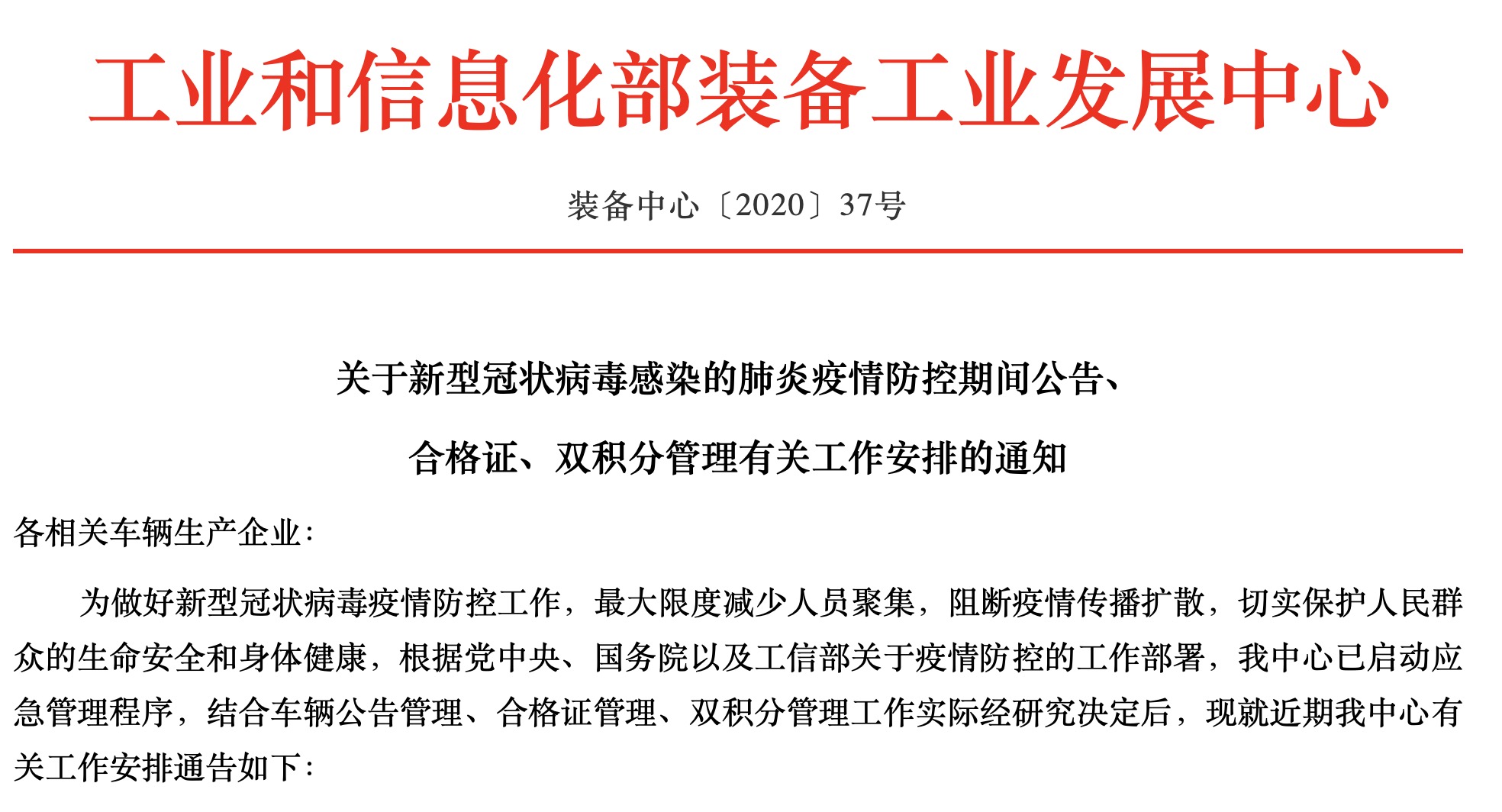 2月5日,工业和信息化部装备司工业发展中心在官网披露《关于新型冠状病毒感染的肺炎疫情防控期间公告、合格证、双积分管理有关工作安排的通知》(简称“《通知》”)。《通知》显示,在疫情防控期间,根据不同地区疫情发展情况和企业实际复工生产情况,对企业准入考核、产品准入审核、机动车合格证管理、乘用车企业双积分管理等提交时限给予延期。