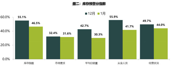 分指数方面,1月库存指数、市场需求指数、平均日销量指数、从业人员指数、经营状况指数均环比下降。区域指数方面,北区指数64.7%,东区指数68.3%,南区指数54.9%,西区指数54.0%。从分品牌类型指数看,1月进口&豪华品牌指数、主流合资品牌指数较上月分别上升6.1%和9.2%,自主品牌指数较上月下降11.6%。