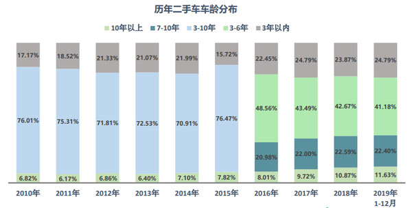 具体来看,使用年限在3-6年的二手车交易量最多,占比达41.18%。其次是3年内为24.79%,7-10年占比为22.40%,10年以上占比为11.63%。