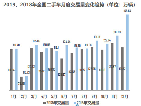 新车市场正面临重重挑战,二手车市场则传来好消息。流通协会数据显示,2019年12月,全国二手车市场交易量为168.64万辆,创单月交易量历史新高,环比大增21.88%;交易金额为1039.27亿元。其中,乘用车环比增长18.69%,商用车环比增长19.63%。