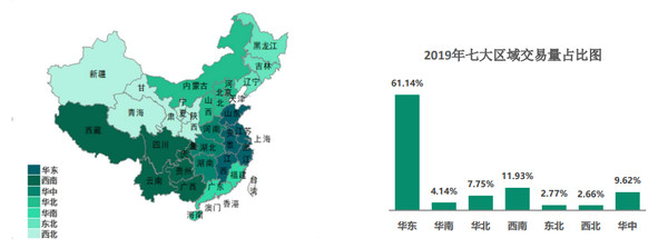 从区域来看,新能源二手车交易量,华东区占比最大为61.14%,华南区占4.14%,华北区占7.75%,西南区占11.93%,东北市场占2.77%,西北市场占2.66%,华中市场占9.62%。