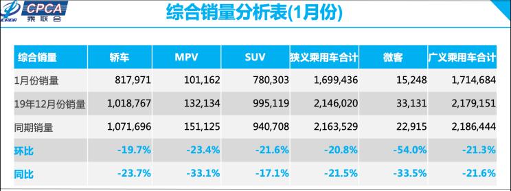 2月13日,乘联会公布2020年1月乘用车产销数据,零售端数据显示,2020年1月,狭义乘用车(轿车+SUV+MPV)零售销量达169.9万辆,同比下降21.5%。乘联会秘书长崔东树表示,1月销量下滑突破20%,使得2020年开年就承受较大的市场压力。