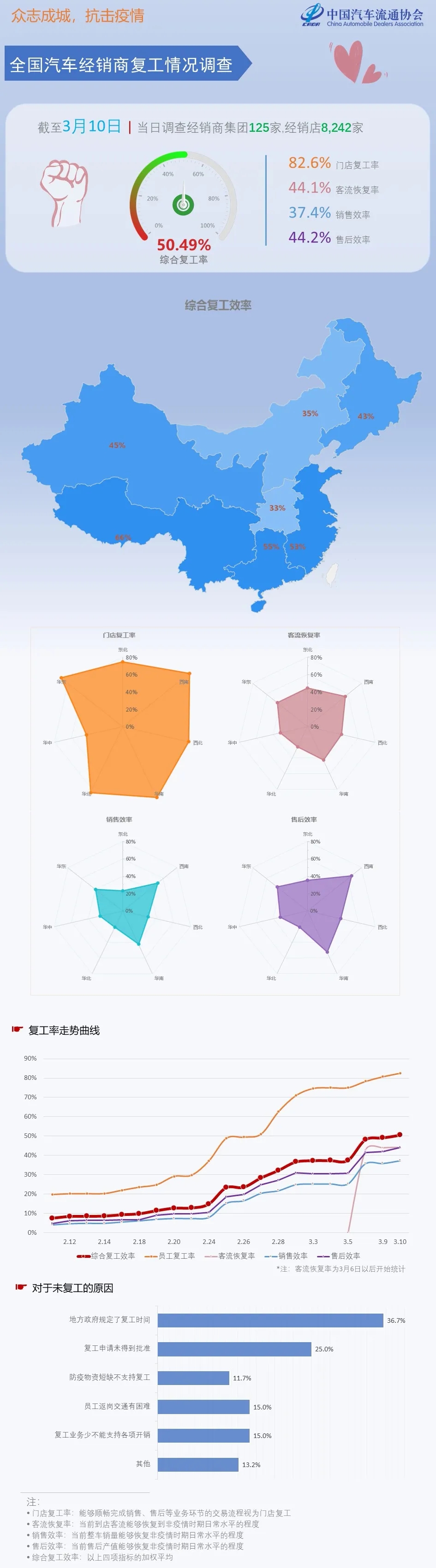 3月10日,中国汽车流通协会按经销商复工调研的范围和样本,截止16时,对会员单位及相关企业进行了经销商节后复工情况当日调研,涵盖了北京、上海、天津、重庆、河北、内蒙古、辽宁、山东、山西、陕西、河南、安徽、湖南、江苏、浙江、江西、四川、贵州、福建、广东等省区市的125家汽车经销商集团,涉及4S店共计8242家,门店复工率82.6%,客流恢复率44.1%,销售效率37.4%,售后效率44.2%。