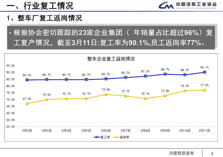 自疫情爆发之始,中汽协就对23家汽车集团展开了密切跟踪。截至3月11日,上述23家企业复工率为90.1%,员工返岗率达到77%,其中长安汽车、奇瑞汽车、吉利汽车、江淮汽车、华晨汽车等企业已经实现全面复工。