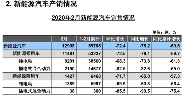 2020年2月新能源汽车产销量分别为9951辆和12908辆,同比分别下滑82.9%和75.2%。其中纯电动乘用车2月售出9291辆,同比下滑73.8%;插电式混合动力乘用车售出2190辆,同比下滑82.6%。自2019年6月26日新能源汽车补贴标准退坡起,中国新能源汽车市场仍然没从连续下滑中摆脱出来。