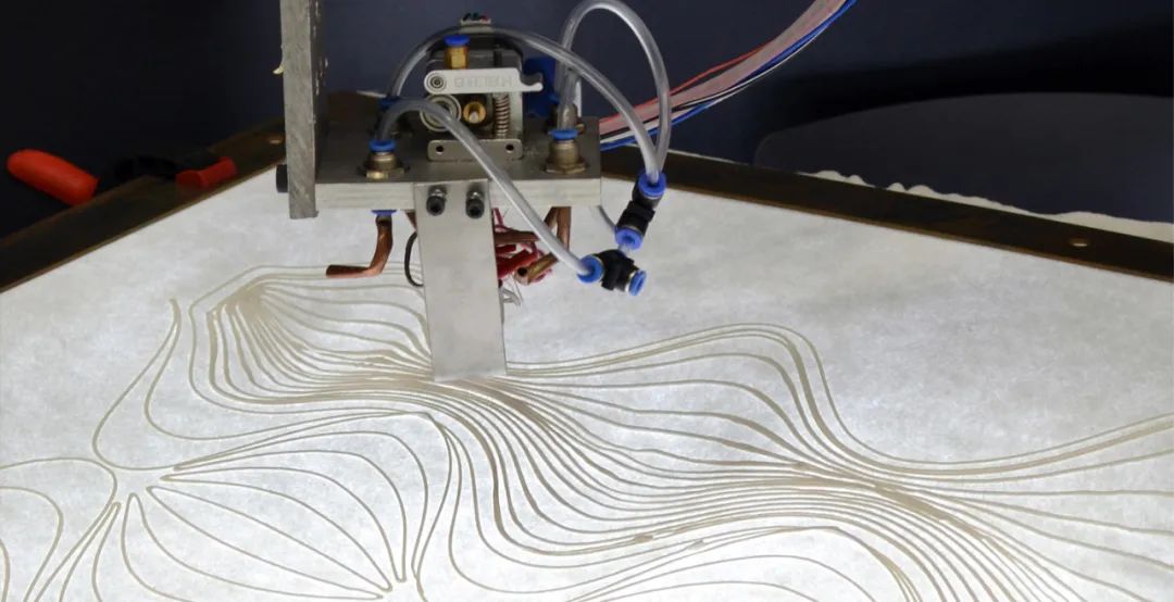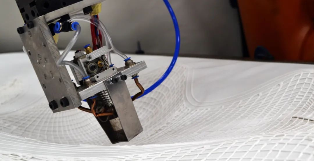 利用机器人增材制造法挤出聚合物材料纤维,来加强纺织品。借助这项作品,现已开发出一种名为“推动和打印”的独特新技术。纤维铺放与成型工艺相结合是这种方法的新颖之处。机器人在推动毛毡来放置细丝的同时,将织物冻成最终形状。此外,由于这种技术无需模具,所以无需使用昂贵且浪费的模具,即可轻松得到的定制双曲率形状。
