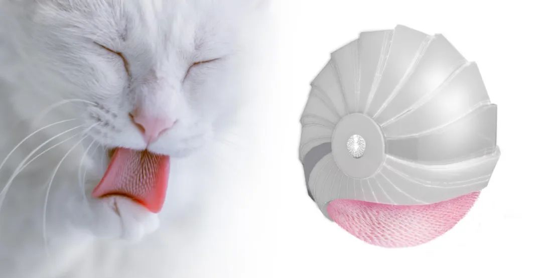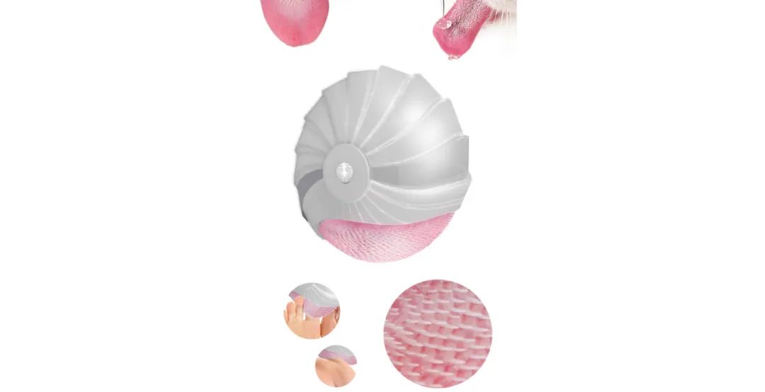 仿生清洁器是一款便携式身体清洁器,可为那些没有机会亦或是无法洗澡或淋浴人士提供帮助。它的外壳里面隐藏着主要机构和装有液体的容器。外壳内的柔软主体是旋转的舌状物。它很柔软,有弹性,可变形成被按压的形状。这样,你就能清洁手指之间或腋下位置的区域。令人最兴奋的是旋转舌状物的质地。舌状物上还有绒毛,就像猫舌头上面一样,可以完美捕捉皮肤上的体液和杂质。滚子上的绒毛有助于清洗带毛发的表面。