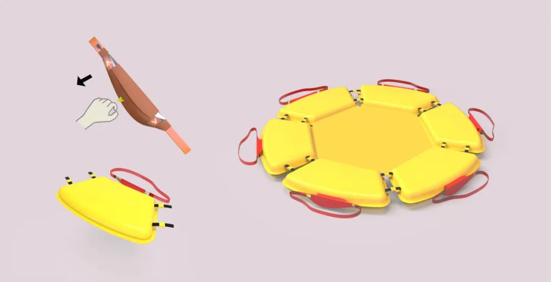 随着紧急情况的发展,学生们通过与指示安全方向的LED灯同步的触觉提示被引导至安全地带。一旦被洪水围困,每个装置都会膨胀,可以形成一个单独的漂浮装置;然而,多个闪光救生器也可捆绑在一起,形成一个漂流筏。利用这样一个网状网络装置,学生们可以与该紧急通讯系统进行连接或增加联系节点。
