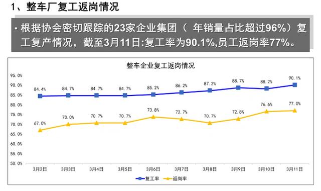 此前,中汽协针对全国23家汽车企业(年销量占比超过96%)进行了调查,截止至3月11日,这些企业全部203个生产基地中,共有183个生产基地复工,复工率达到90.1%,复产率为39.2%,员工返岗率为77.0%。