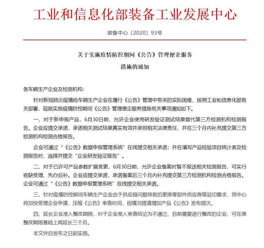 三、针对疫情防控期间车辆生产企业由于供应链问题导致的更换零部件供应商等迫切需求,我中心将加快受理企业申请,压缩《公告》审查时间,视情况提请增加产品《公告》发布频次。