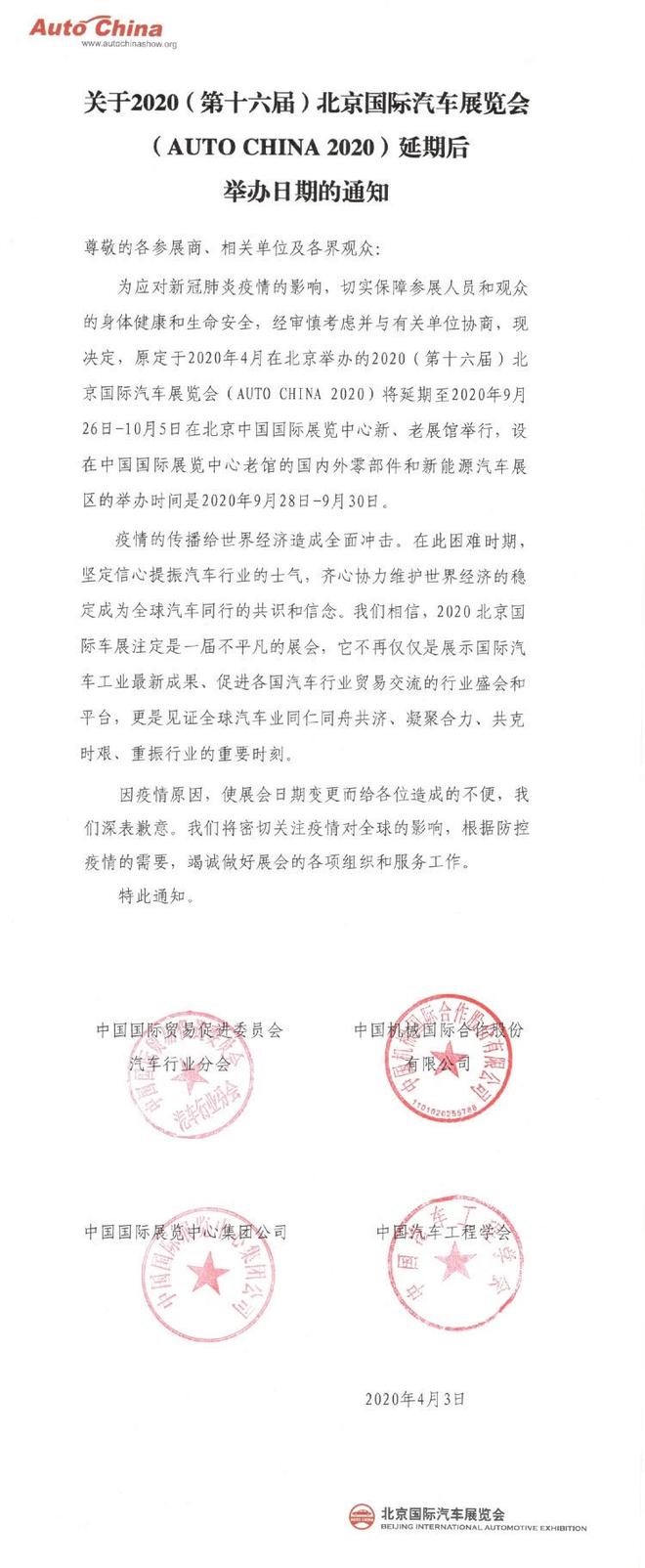 4月3日,新浪汽车从官方获悉,原定于2020年4月在北京举办的2020(第十六届)北京国际汽车展览会(AUTO CHINA 2020)将延期至2020年9月26日-10月5日在北京中国国际展览中心新、老展馆举行,设在中国国际展览中心老馆的国内外零部件和新能源汽车展区的举办时间是2020年9月28日-9月30日。