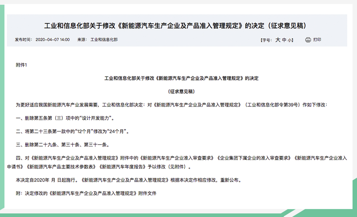 随着各大车企都在大力发展电气化,新能源产品也越来越多的推出市场。日前,网通社从工信部获悉,为更好适应我国新能源汽车产业发展的需要,工信部组织起草了《工业和信息化部关于修改<新能源汽车生产企业及产品准入管理规定>的决定(征求意见稿)》,面向社会公开征求意见。