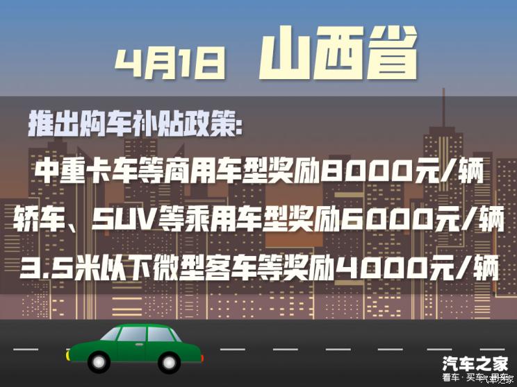 [汽车之家 行业] 为拉动汽车相关企业全面复工复产,全国多地发布了刺激汽车消费的政策通知。近日,山西省政府办公厅发布了《关于实施汽车消费专项奖励的通知》。对于山西省消费者购买本省整车企业生产的汽车,并在省内进行机动车注册登记的整车产品(传统燃油车需满足“国六”排放标准),给予购置车辆一次性消费奖励。