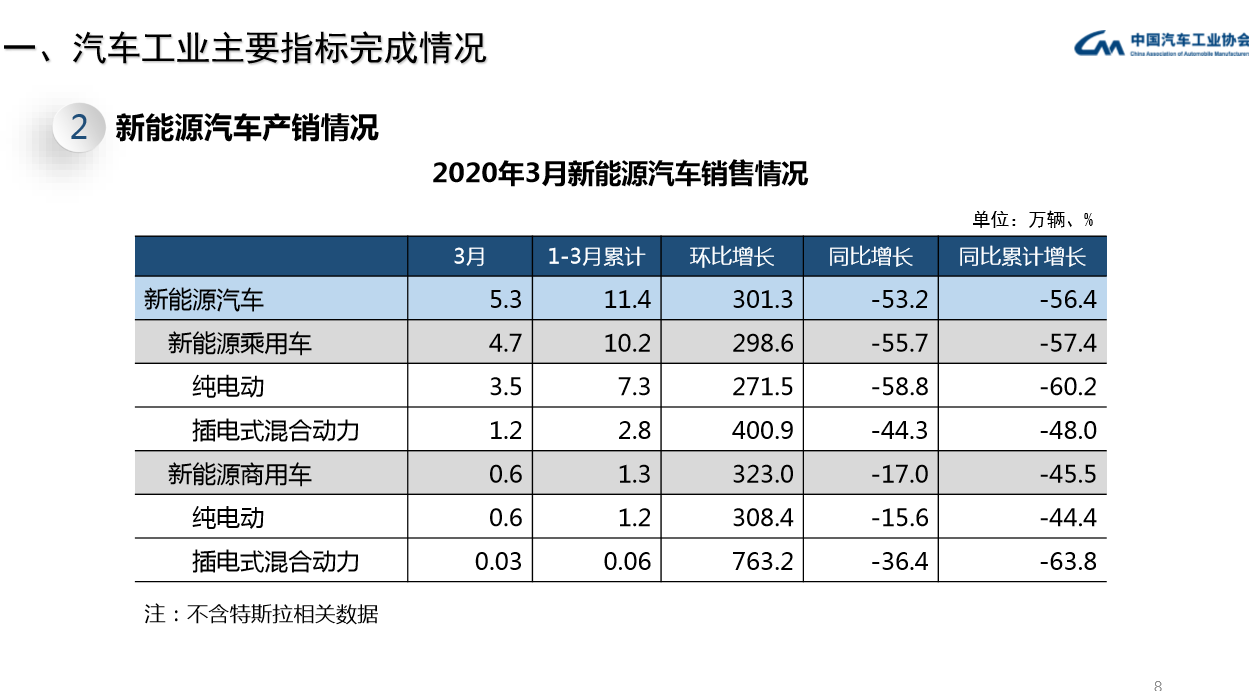2020年1-3月,新能源汽车产销分别完成10.5万辆和11.4万辆,同比下降60.2%和56.4%。其中纯电动汽车产销分别完成7.7万辆和8.5万辆,同比分别下降61.8%和58.6%;插电式混合动力汽车产销分别完成2.8万辆和2.9万辆,同比分别下降55.0%和48.5%。为了提振新能源汽车销量,日前国务院已宣布将新能源汽车购置补贴和免征车辆购置税政策延长2年。中汽协表示,上述政策将使中国新能源汽车市场逐步恢复信心。(文/汽车之家 陈灿)