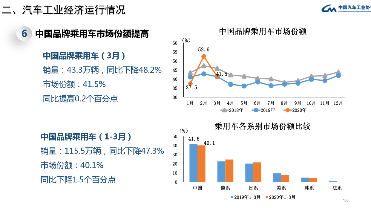 2020年1-3月,中国品牌乘用车共销售115.5万辆,同比下降47.3%,市场占有率比上年同期下降1.5个百分点。其中中国品牌轿车、SUV和MPV市场占有率分别为19.5%、57.6%和79.4%,相比上月均呈下降态势。