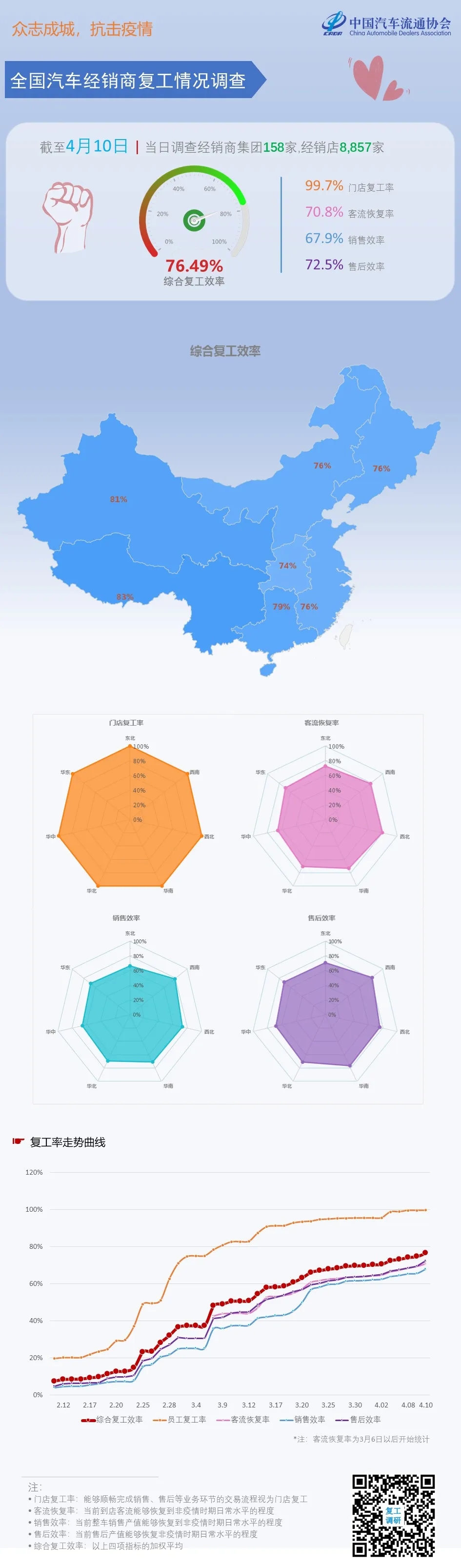 4月10日,中国汽车流通协会按经销商复工调研的范围和样本,截止16时,对会员单位及相关企业进行了经销商节后复工情况当日调研,涵盖了北京、上海、天津、重庆、河北、内蒙古、辽宁、山东、山西、陕西、河南、安徽、湖南、江苏、浙江、江西、四川、贵州、福建、广东等省区市的158家汽车经销商集团,涉及4S店共计8857家,门店复工率99.7%,客流恢复率70.8%,销售效率67.9%,售后效率72.5%。